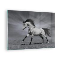 Glasbild - Bild auf glas - Ein Schwarzweißfoto eines galoppierenden Pferdes auf einem offenen Feld. - 70x50cm - Geboren um Freude zu bereiten - Moderne Wanddekoration für Wohnzimmer und Schlafzimmer ARTTOR