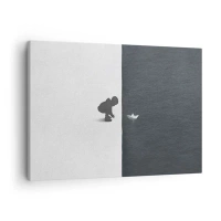 Bild auf Leinwand - Leinwandbild - Eine Kinderfigur mit einem Papierboot vor einem Hintergrund aus kontrastierenden Hälften - 70x50cm - Tolle Expedition - Moderne Wanddekoration für Wohnzimmer und Schlafzimmer ARTTOR
