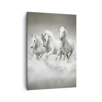 Bild auf Leinwand - Leinwandbild - Zwei weiße Pferde galoppieren vor hellem Hintergrund - 50x70cm - Weiße Macht! - Moderne Wanddekoration für Wohnzimmer und Schlafzimmer ARTTOR