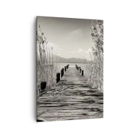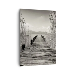 Bild auf Leinwand - Leinwandbild - Ein Holzsteg zwischen hohen Gräsern über einem sepiafarbenen See - 50x70cm - In der Stille des Grases - Moderne Wanddekoration für Wohnzimmer und Schlafzimmer ARTTOR