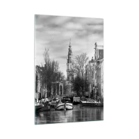 Glasbild - Bild auf glas - Schwarz-Weiß-Ansicht eines Kanals in Amsterdam - 50x70cm - Amsterdamer Atmosphäre - Moderne Wanddekoration für Wohnzimmer und Schlafzimmer ARTTOR