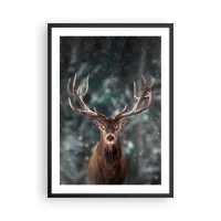 Poster in einem schwarzem Rahmen - Porträt eines Hirsches mit beeindruckendem Geweih vor der Kulisse eines Winterwaldes - 50x70cm - Gekrönter König des Waldes - Moderne Wanddekoration für Wohnzimmer und Schlafzimmer ARTTOR