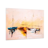 Glasbild - Bild auf glas - Bunte Boote vor der Kulisse eines impressionistischen Sonnenuntergangs - 70x50cm - Abend im Yachthafen - Moderne Wanddekoration für Wohnzimmer und Schlafzimmer ARTTOR