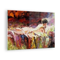 Glasbild - Bild auf glas - Impressionistischer weiblicher Akt auf buntem Stoff - 70x50cm - Venus in Gedanken - Moderne Wanddekoration für Wohnzimmer und Schlafzimmer ARTTOR