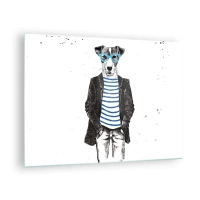 Glasbild - Bild auf glas - Illustration eines Hundes mit Matrosenhemd und Brille auf weißem Hintergrund - 70x50cm - Auf den Charme des Hundes - Moderne Wanddekoration für Wohnzimmer und Schlafzimmer ARTTOR