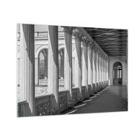 Glasbild - Bild auf glas - Eine schwarz-weiße Kolonnade mit einem rhythmischen Spiel aus Licht und Schatten - 70x50cm - Sonnige Arkade - Moderne Wanddekoration für Wohnzimmer und Schlafzimmer ARTTOR