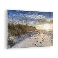 Glasbild - Bild auf glas - Sandstrand bei Sonnenuntergang mit Gräsern an der Düne - 70x50cm - Einladung zu einem Spaziergang - Moderne Wanddekoration für Wohnzimmer und Schlafzimmer ARTTOR