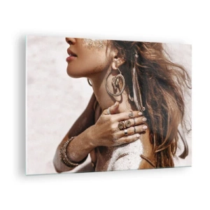 Glasbild - Bild auf glas - Stilvolle Frau mit Schmuck und Sand auf der Haut am Strand - 70x50cm - Königin des wilden Strandes - Moderne Wanddekoration für Wohnzimmer und Schlafzimmer ARTTOR