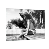 Glasbild - Bild auf glas - Frau mit Hut sitzt am Pool in Schwarz und Weiß - 70x50cm - Sommertraum - Moderne Wanddekoration für Wohnzimmer und Schlafzimmer ARTTOR