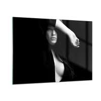Glasbild - Bild auf glas - Eine Frau in Schwarz in sinnlicher Pose vor dunklem Hintergrund - 70x50cm - Schule der Verführung - Moderne Wanddekoration für Wohnzimmer und Schlafzimmer ARTTOR