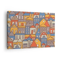 Bild auf Leinwand - Leinwandbild - Bunte Häuser im grafischen Stil auf hellem Hintergrund - 70x50cm - Hinter dem Haus ist das Haus - Moderne Wanddekoration für Wohnzimmer und Schlafzimmer ARTTOR