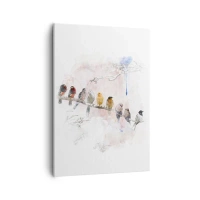 Bild auf Leinwand - Leinwandbild - Bunte Vögel auf einem Ast im Aquarellstil - 50x70cm - Geflügeltes Treffen - Moderne Wanddekoration für Wohnzimmer und Schlafzimmer ARTTOR