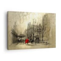 Bild auf Leinwand - Leinwandbild - Eine rote Figur in einer nostalgischen urbanen Umgebung - 70x50cm - Ein Date im Londoner Nebel - Moderne Wanddekoration für Wohnzimmer und Schlafzimmer ARTTOR