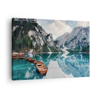 Bild auf Leinwand - Leinwandbild - Ein See mit Booten, umgeben von Bergen - 70x50cm - Wir zeigen Ihnen Schönheit - Moderne Wanddekoration für Wohnzimmer und Schlafzimmer ARTTOR