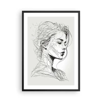 Poster in einem schwarzem Rahmen - Eine Skizze einer Frau mit wallendem Haar, erstellt im minimalistischen Stil. - 50x70cm - Porträt im Gedanken - Moderne Wanddekoration für Wohnzimmer und Schlafzimmer ARTTOR