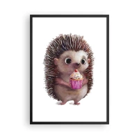 Poster in einem schwarzem Rahmen - Ein süßer Igel hält einen bunten Cupcake - 50x70cm - Der Feiertag ist jeden Tag - Moderne Wanddekoration für Wohnzimmer und Schlafzimmer ARTTOR