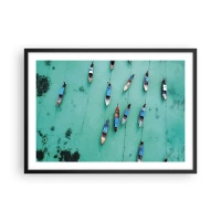 Poster in einem schwarzem Rahmen - Boote auf türkisfarbenem Wasser aus der Vogelperspektive - 70x50cm - In freudiger Erwartung - Moderne Wanddekoration für Wohnzimmer und Schlafzimmer ARTTOR
