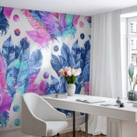 Maßgeschneiderte Fototapete Premium Sand - Pflaumen in Pink und Blau - Vogelfeder, Bunte Illustration, Grafik