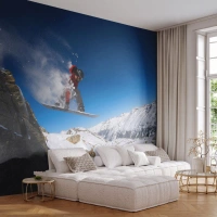 Fototapete Premium Sand - Ein Snowboarder springt vor der Kulisse schneebedeckter Berge. - 100x70cm - Und du wurdest Teil des Raums - Moderne Wanddekoration für Wohnzimmer und Schlafzimmer ARTTOR
