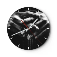 Wanduhr - Glasuhr - Nahaufnahme von Händen, die einen Gitarrenhals halten, in Schwarz und Weiß - 30x30cm - Gebet des Künstlers - Moderne Wanddekoration für Wohnzimmer, Küche und Schlafzimmer ARTTOR