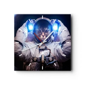Wanduhr - Glasuhr - Eine Katze im Astronautenanzug mit der Erde im Hintergrund und einem hellen Licht. - 30x30cm - Houston, du hast ein Problem - Moderne Wanddekoration für Wohnzimmer und Schlafzimmer ARTTOR