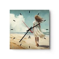 Wanduhr - Glasuhr - Eine Frau in einem weißen Kleid geht an einem sonnigen Tag am Strand spazieren - 30x30cm - Der Sonne und dem Wind begegnen - Moderne Wanddekoration für Wohnzimmer und Schlafzimmer ARTTOR