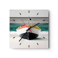 Wanduhr - Glasuhr - Ein Boot am Strand mit türkisfarbenem Meer im Hintergrund - 30x30cm - An seinem Platz - Moderne Wanddekoration für Wohnzimmer und Schlafzimmer ARTTOR