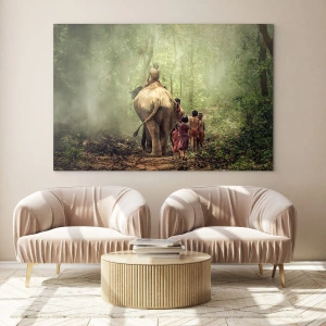- Dieses bezaubernde Gemälde zeigt einen Elefanten im Wald, geführt von Kindern in traditionellen Kostümen. Eine Szene voller Frieden und Harmonie, perfekt für Innenräume, die von der Natur oder der östlichen Kultur inspiriert sind.