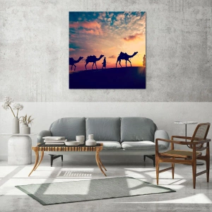 Diese Dekoration ist die perfekte Wahl für alle, die ein Gemälde mit exotischer Atmosphäre suchen. Eine Kamelkarawane in der Wüste ist ein Bild voller Frieden, der Schönheit der Natur und der Atmosphäre des Wanderns.