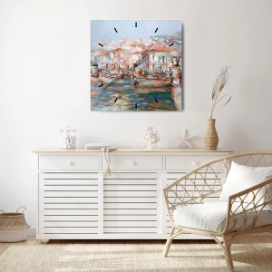 Wanduhr - Glasuhr - Hafenimpression mit Booten und Gebäuden - 30x30cm - Pastell-Sommerferien - Moderne Wanddekoration für Wohnzimmer und Schlafzimmer ARTTOR