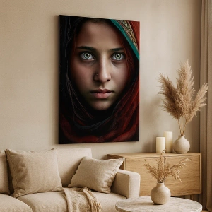 • Das Porträt einer Frau mit intensivem Blick, eingerahmt von warmen Rottönen und grünen Akzenten. Diese geheimnisvolle und elegante Komposition passt perfekt zu orientalischen oder klassischen Innenräumen.