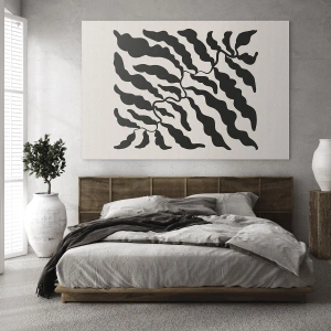 - Eine organische Komposition aus schwarzen Blättern auf hellem Hintergrund im modernen Stil. Die minimalistische, von der Natur inspirierte Form passt perfekt in stilvolle Innenräume. Das botanische Motiv bringt Ruhe und Harmonie in den Raum.