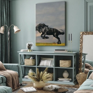 Das Gemälde wurde auf hochwertige Leinwand gedruckt, was Haltbarkeit und Farbintensität gewährleistet. Sein horizontales Format von 70 x 50 cm ist ideal für ein Wohnzimmer, Büro oder Schlafzimmer. Der Kontrast zwischen dem schwarzen Pferd und dem hellen Hintergrund verleiht der Komposition außergewöhnliche Tiefe und Ästhetik.