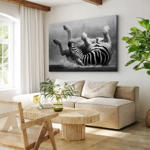 Nicht nur ein Pferd würde lachen ist ein einzigartiger Leinwanddruck, der einen ungewöhnlichen Moment im Leben von Tieren auf einer Safari darstellt. Ein schwarz-weißes Zebra in einer dynamischen Position, das sich im Sand wälzt, fällt durch seine Natürlichkeit und Harmonie auf. Die Schwarz-Weiß-Farben verleihen dem Bild Klasse und betonen den Kontrast zwischen dem Zebramuster und der Umgebung.