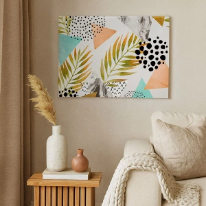 Bild auf Leinwand - Leinwandbild - Tropisches Muster mit Blättern und geometrischen Formen - 100x70cm - Dekoration mit Palmblatt - Moderne Wanddekoration für Wohnzimmer und Schlafzimmer ARTTOR
