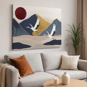 - Dieser dezente Leinwanddruck im Format 70 x 50 cm zeigt fliegende Kraniche vor der Kulisse von Bergen und einer roten Sonne. Perfekt für eine Einrichtung im asiatischen Stil, bringt er Ruhe und Harmonie.