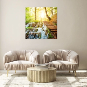 Hängen Sie dieses Wandbild in Ihren Raum, um Inspiration und Ruhe zu bringen. Der Waldwasserfall mit Holzweg fügt sich perfekt in verschiedene Arrangements ein und verleiht dem Interieur einen einzigartigen Charakter.