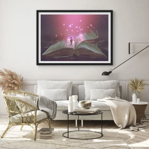 Poster in einem schwarzem Rahmen - Eine Figur tritt in einem magischen Licht auf ein offenes Buch. - 70x50cm - Einladung in eine andere Welt - lesen Sie! - Moderne Wanddekoration für Wohnzimmer und Schlafzimmer ARTTOR