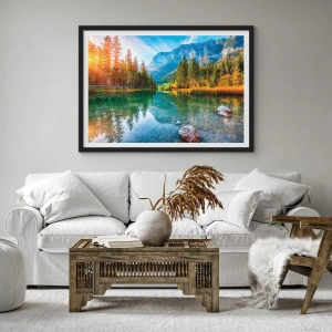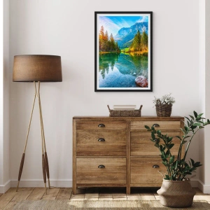 Poster in einem schwarzem Rahmen - Ein See in den Bergen, umgeben von Bäumen und der Spiegelung der Berge im Wasser - 50x70cm - Die Sanftheit des Herbstes - Moderne Wanddekoration für Wohnzimmer und Schlafzimmer ARTTOR