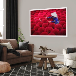 Poster - Eine Frau mit traditionellem Hut zwischen roten Räucherstäbchen - 100x70cm - Im Reisfeld - Moderne Wanddekoration für Wohnzimmer und Schlafzimmer ARTTOR