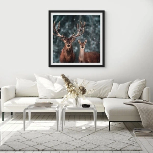 Poster in einem schwarzem Rahmen - Ein Hirschpaar vor der Kulisse eines Winterwaldes - 50x70cm - Herr des Waldes mit seiner Frau - Moderne Wanddekoration für Wohnzimmer und Schlafzimmer ARTTOR