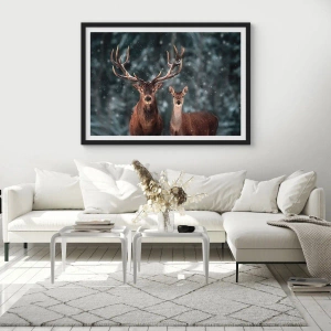 - Das Poster zeigt ein Hirschpaar vor dem Hintergrund eines Winterwaldes, ein subtiles Naturmotiv, perfekt für skandinavische und minimalistische Inneneinrichtungen.
