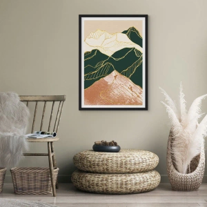 - Das Poster zeigt eine abstrakte Berglandschaft aus goldenen Linien und geometrischen Formen. Die elegante Farbgebung kombiniert Grün-, Braun- und Beigetöne.