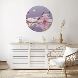 „Die Hitze des Segels, die Kälte des Eises“ ist eine außergewöhnliche Wanduhr, die den Betrachter in eine winterliche, arktische Landschaft entführt. Das Gemälde zeigt ein einsames Segelschiff mit roten Segeln, das zwischen majestätischen Eisbergen gleitet. Die gesamte Szenerie wird durch den im Wasser reflektierten Mond ergänzt, der der Komposition eine magische und leicht geheimnisvolle Atmosphäre verleiht. Pastelltöne in Rosa und Blau schaffen eine harmonische, beruhigende Atmosphäre.
