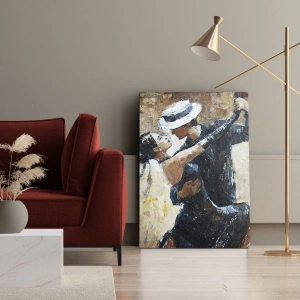 Die warmen Farben des Hintergrunds und die kontrastierenden Kostüme des tanzenden Paares betonen die Dynamik des Tanzes und die Eleganz der gesamten Szene. Es ist eine ideale Dekoration für Liebhaber von Kunst, Tanz und romantischer Atmosphäre, die perfekt in ein Wohnzimmer, Schlafzimmer oder einen künstlerischen Raum passt.