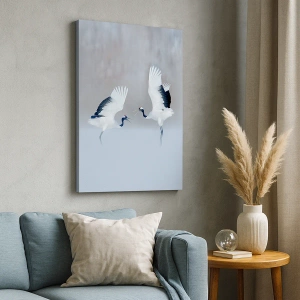 Bild auf Leinwand - Leinwandbild - Zwei Kraniche tanzen in einer nebligen Landschaft - 50x70cm - Tanz im Nebel - Moderne Wanddekoration für Wohnzimmer und Schlafzimmer ARTTOR