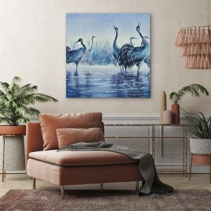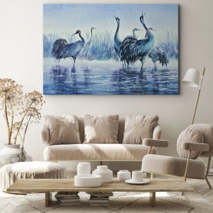 Bild auf Leinwand - Leinwandbild - Kräne vor dem Hintergrund von Nebel und Wasser in Blautönen - 50x70cm - Morgentliches Treffen - Moderne Wanddekoration für Wohnzimmer und Schlafzimmer ARTTOR
