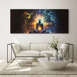 Glasbild - Bild auf glas - Eine meditierende Silhouette in einer kosmischen Farbexplosion - 50x70cm - Kosmischer Frieden - Moderne Wanddekoration für Wohnzimmer und Schlafzimmer ARTTOR