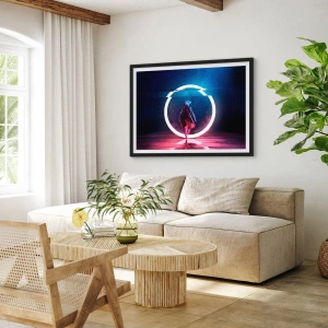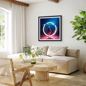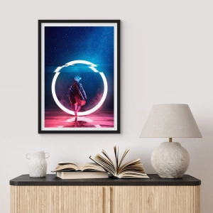 Poster in einem schwarzem Rahmen - Eine Figur in futuristischem Outfit und VR-Brille vor dem Hintergrund eines Lichtkreises - 50x70cm - Zwischen den Welten - Moderne Wanddekoration für Wohnzimmer und Schlafzimmer ARTTOR
