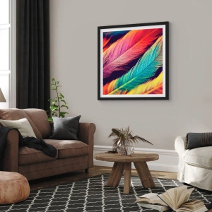- Dieses Poster zeigt bunte Federn in leuchtenden Farbtönen, die sich von einem dunklen Hintergrund abheben. Die Details und die Textur verleihen ihm Tiefe und Eleganz.